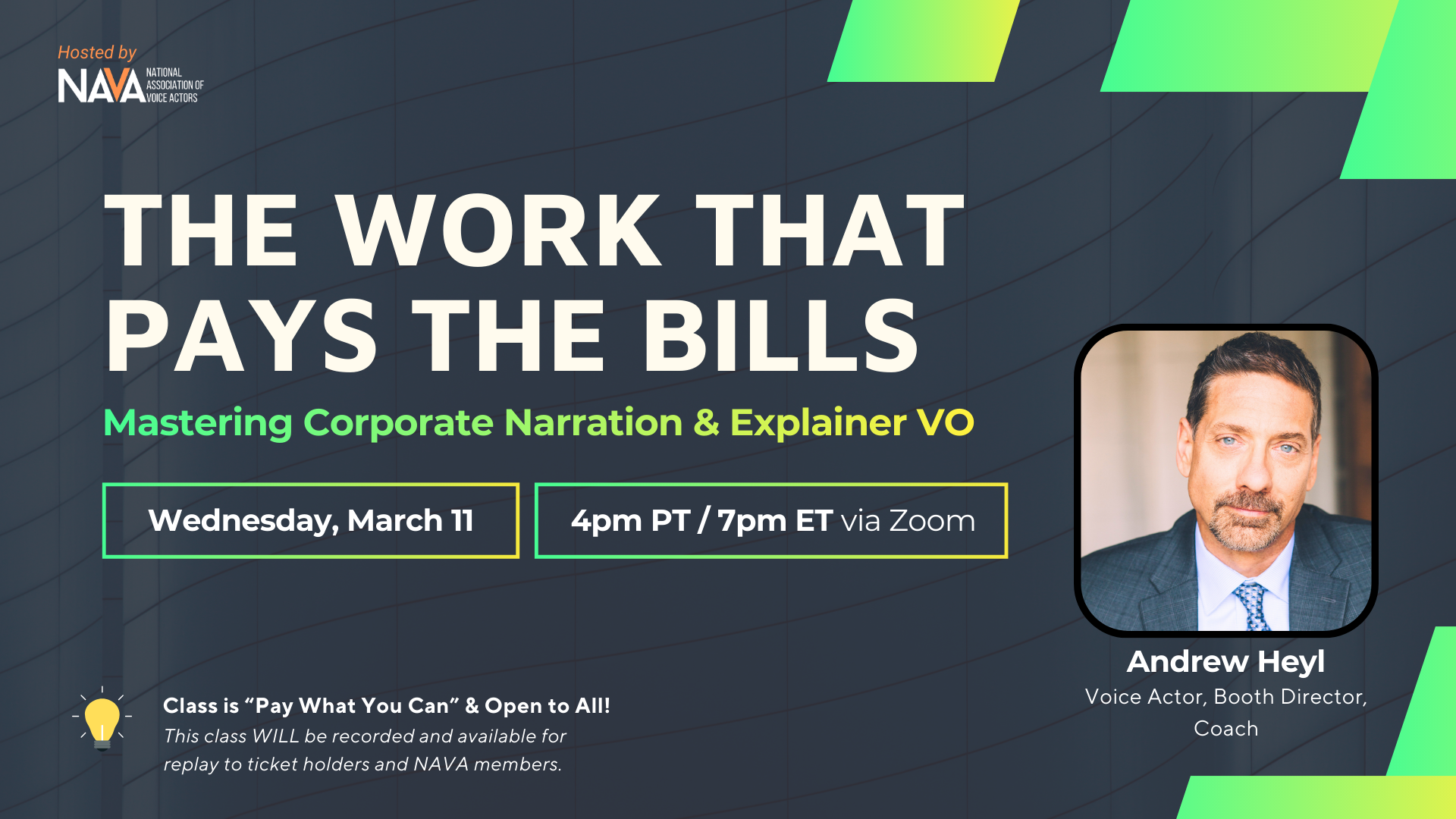 CLASS REPLAYS BECOME A MEMBER NAVA MEMBER REPLAYS NAVA Members: Replays can be found on the MY BENEFITS page after you have LOGGED INTO YOUR ACCOUNT. For additional help, email tracy@navavoices.org MEMBER REPLAYS NAVA members: Replays can be found on the My Benefits page All AMA Community Class Contract Series Webinars Community Class Protected: Bringing the Page to Life:Audiobook Narrationw/ Nan McNamara Community Class Protected: Andrew Heyl “Corporate Narration” 3.11.26 Community Class Protected: Kelly Moscinski “Taking Commercial Auditions From No to Whoa!” 2.17.26 Community Class Protected: Maria Pendolino: Live Session workshop Community Class Protected: Dave Walsh–True Tell 12.04.25 Community Class Protected: Terry Berland awesome reads 11.13.25 Community Class Protected: Give Great voice with Tasia valenza 11.6.25 Community Class Protected: Jeff Howell Voice Actor Pitfalls 10.16.25 Community Class Protected: Dave Fennoy–Video Game Characters 10.9.25 Community Class Protected: 9 Power Moves with Lili Wexu 9.17.25 Community Class Protected: Directed Sessions Decoded with Danielle Famble and Brandon Perry 9.8.25 Community Class Protected: Email Marketing with Tom Aglio 8.26.25 Community Class Protected: Anime Voice Acting with Elise Baughman 8.14.25 Community Class Protected: Build Your Business Like a Boss 8.13.25 Community Class Protected: Failing Spectacularly: Gina Scarpa 7.22.25 Community Class Protected: Exploring the Audio Description Niche with Bridget Nelton 7.9.25 Community Class Protected: Creating Characters for Animation and Video Games 6.24.25 Community Class Protected: Command the Booth 5.27.25 Community Class Protected: Kay Bess: finding the sweet spot in every spot 6.9.25 Community Class Protected: Non-Broadcast Genres: The Secret to A More Consistent Career (Carin Gilfry) Community Class Protected: Time: You Don’t Have Enough 4.2.25 Community Class Protected: Make Your Own Luck 3.12.25 Community Class Protected: Conexión latina 2.25.25 AMA Protected: NAVA Interactive Strike town hall 2.26.25 Community Class Protected: Alexander Technique 2.13.25 Benefits Protected: Class with a cause with Lance kistler Community Class Protected: Building A Career in Audio Drama Community Class Protected: Adam Weisman 1.8.25 Community Class Protected: Dani States Mind Your VO Business 11.20.24 Community Class Protected: Challenging Voice AI 10.22.24 Community Class Protected: Emma O’Neil: Unlock Your Career Potential 10.3.24 Community Class Protected: Heidi Dean: Instagram Marketing 9.24.24 Community Class Protected: Cristina Milizia: Making a Career In Animation 9.16.24 Community Class Protected: Lori Alan Animation 8.14.24 AMA IMA AMA 7.25.24 Community Class Protected: Anna Garduno Community Class 7.22.24 Community Class Protected: Lady Boss Power Hour 7.11.24 Community Class Protected: Kids In Voiceover with Martha Kahn 6.10.24 Community Class Protected: What Agents Wish You Knew 6.25.24 AMA NAVA AMA DC EDITION 5.31.24 Community Class Protected: JORDAN REYNOLDS 5.20.24 Community Class George Whittam: Creating Professional Audio On The Go 4.30.24 Community Class YES U CAN: Converting Non-Union to Union Community Class No Lucks Given: Matthew Parham Community Class 3.17.24 AMA Zeke Alton Animation Agreement AMA 3.14.24 Community Class Protected: CARIN GILFRY COMMUNITY CLASS 2.14.24 AMA NAVA ZEKE ALTON REPLICA STUDIOS AGREEMENT AMA AMA NAVA AMA 1.15.24 Webinars DAVE FENNOY COMMUNITY CLASS REPLAY 7.24.23 Conferences NAVA SDCC Panel Replay